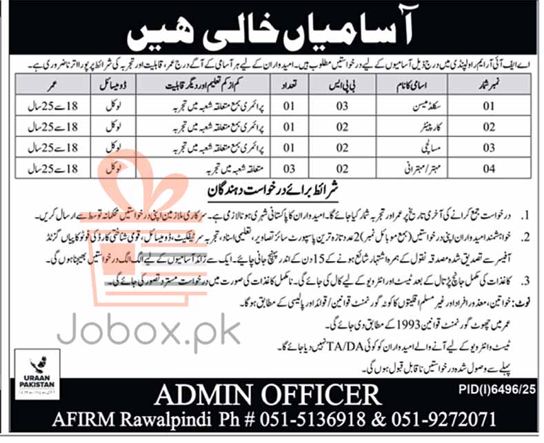 Contact Information: Admin Officer, AFIRM Rawalpindi. Phone: 051-5136918 / 051-9272071.