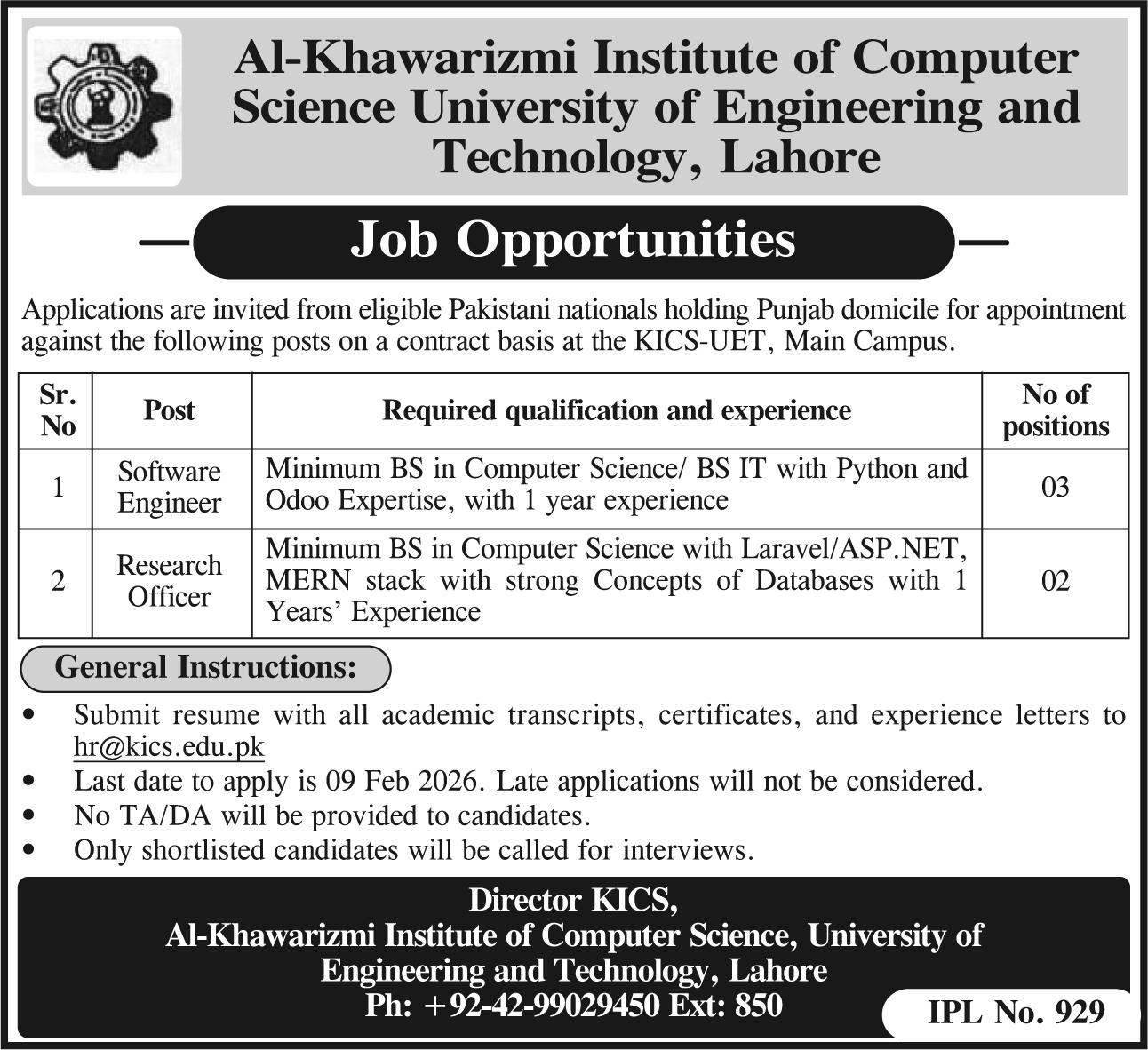 Applications are invited from eligible Pakistani nationals holding Punjab domicile for appointment against the following posts on a contract basis at the KICS-UET, Main Campus.