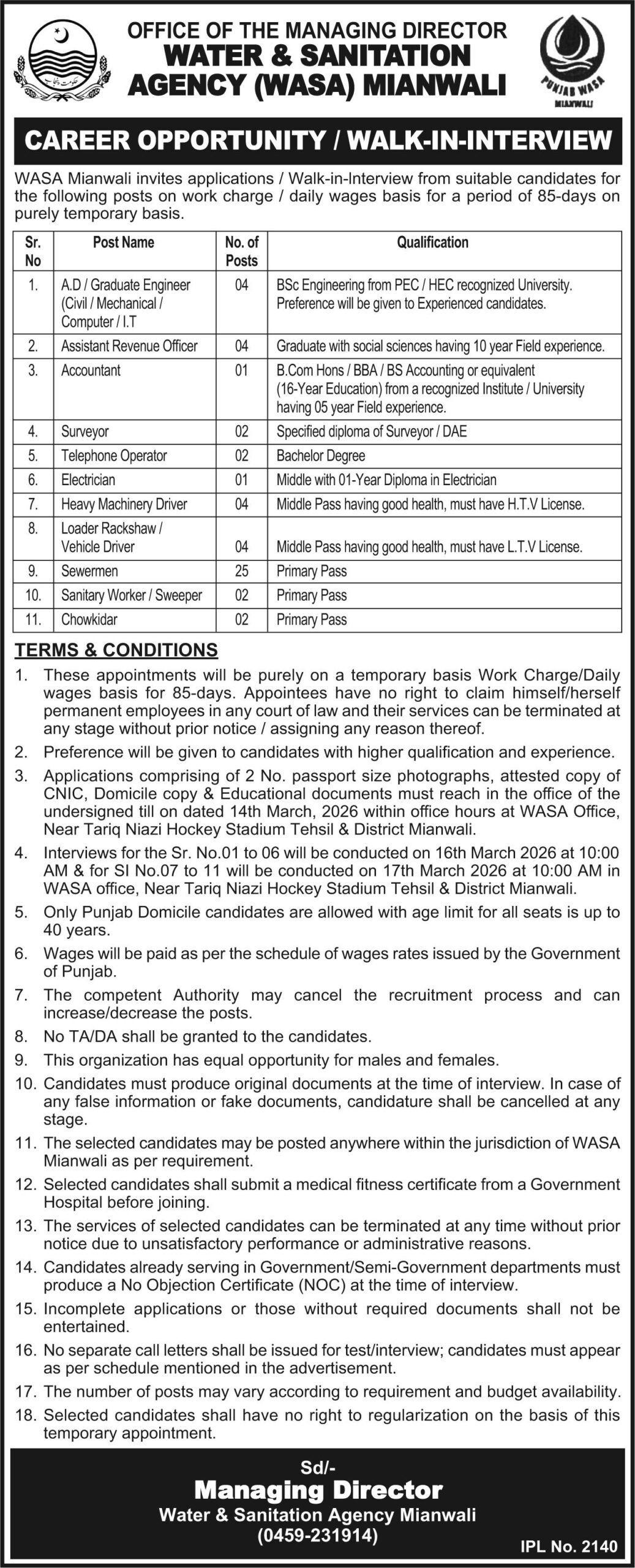 - Interviews for the Sr. No.01 to 06 will be conducted on 16th March 2026 at 10:00 AM & for Sr. No.07 to 11 will be conducted on 17th March 2026 at 10:00 AM in WASA office, Near Tariq Niazi Hockey Stadium Tehsil & District Mianwali.