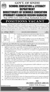 Applications from eligible candidates are invited having Domicile and Permanent Residents Certificate (PRC) of District Central Karachi against the following vacancies in Office of the District Education Officer (Primary), District Central Karachi as per qualification & experience Indicated against each within fifteen (15) days of publication of this advertisement.