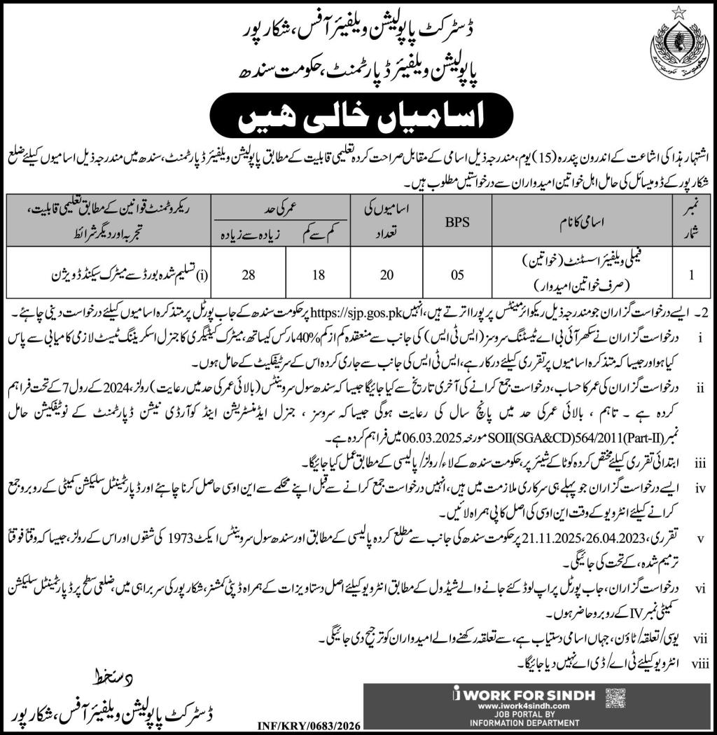District Population Welfare Office, Shikarpur, under the Population Welfare Department, Government of Sindh, has announced latest vacancies for local female residents of Shikarpur district. Applications are invited from eligible female candidates holding domicile of Shikarpur district. Candidates must apply through the Sindh Government Job Portal within 15 days of advertisement publication.
