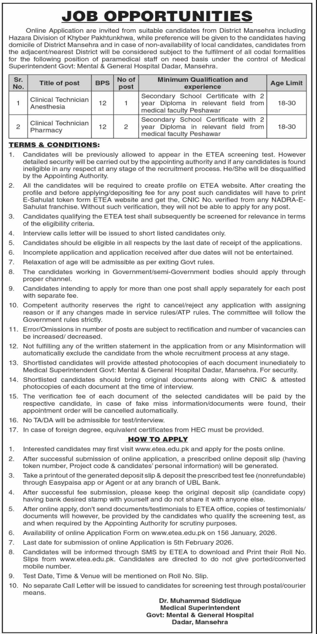 Online applications are invited from suitable candidates for paramedical staff positions at Government Mental & General Hospital Dadar, Mansehra. Preference will be given to candidates domiciled in District Mansehra (Hazara Division, KPK), with candidates from adjacent districts considered only if local candidates are unavailable.