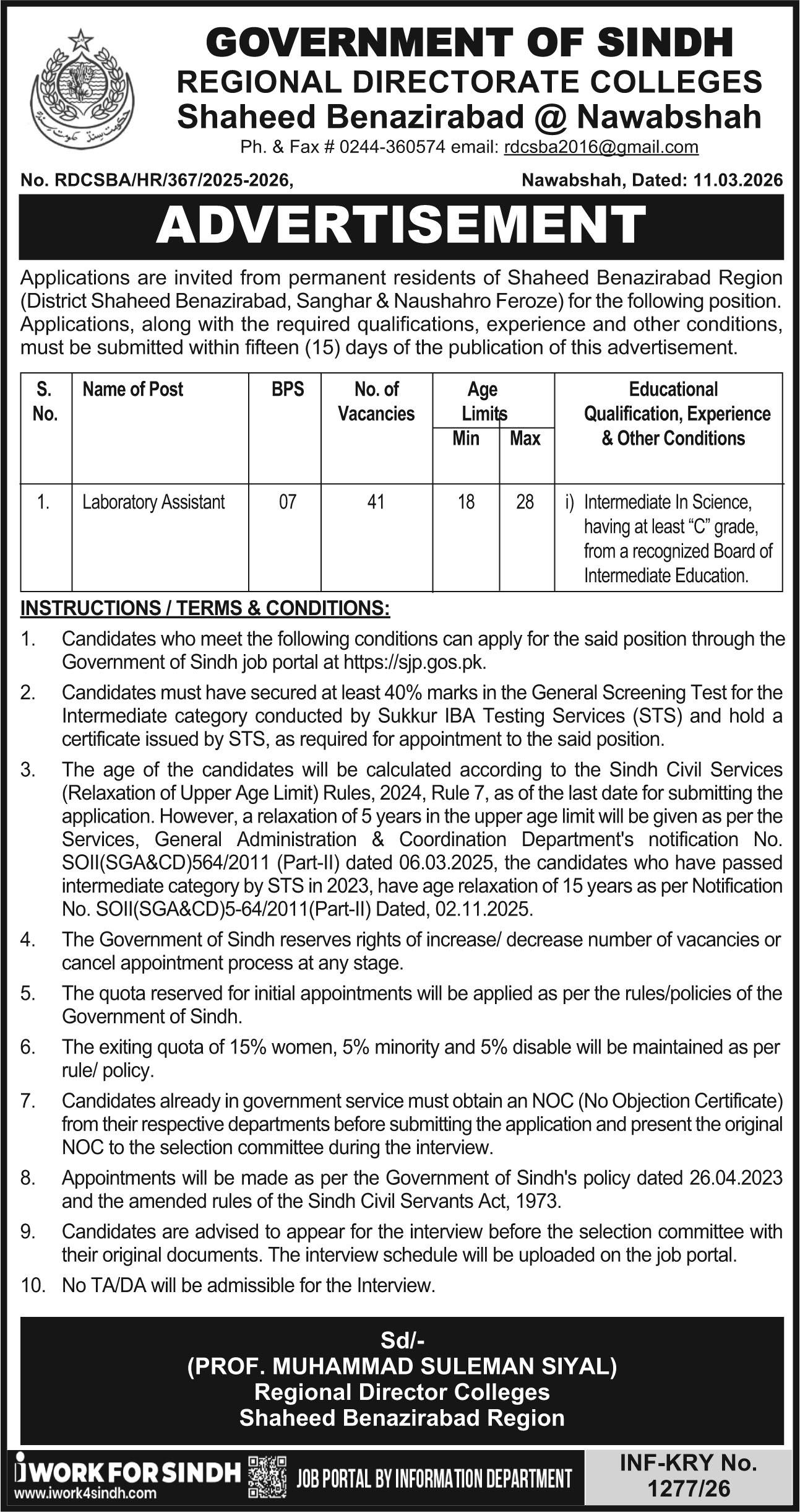The Government of Sindh, Regional Directorate Colleges Shaheed Benazirabad @ Nawabshah, is inviting applications for the position of Laboratory Assistant. This is a government job opportunity for permanent residents of Shaheed Benazirabad Region (District Shaheed Benazirabad, Sanghar & Naushahro Feroze).