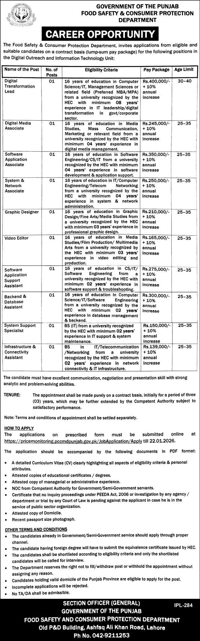 The Food Safety & Consumer Protection Department, invites applications from eligible and suitable candidates on a contract basis (lump-sum pay package) for the following positions in the Digital Outreach and Information Technology Unit: