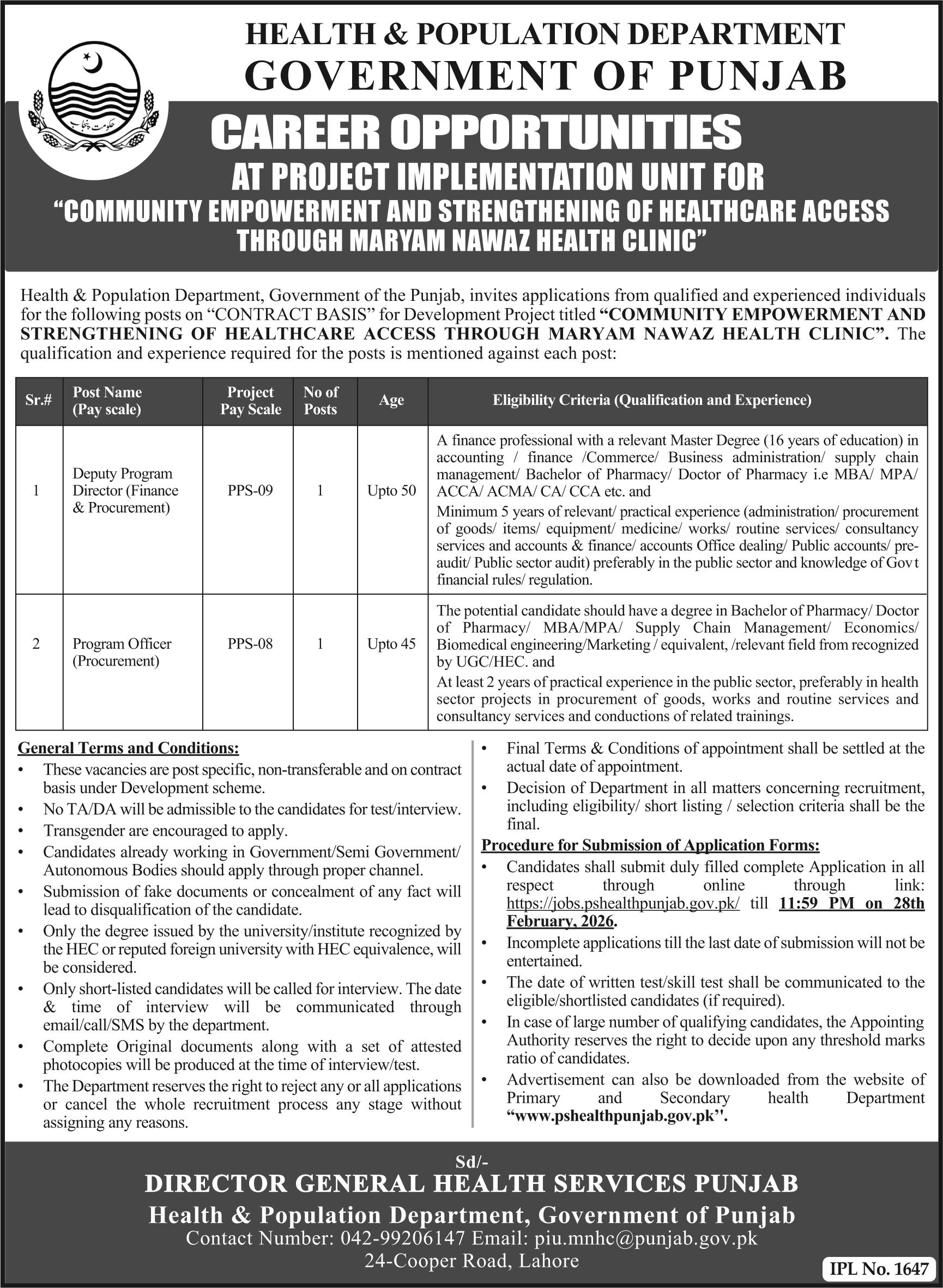 Health & Population Department, Government of the Punjab, invites applications from qualified and experienced individuals for the following posts on “CONTRACT BASIS” for Development Project titled “COMMUNITY EMPOWERMENT AND STRENGTHENING OF HEALTHCARE ACCESS THROUGH MARYAM NAWAZ HEALTH CLINIC”. The qualification and experience required for the posts is mentioned against each post: