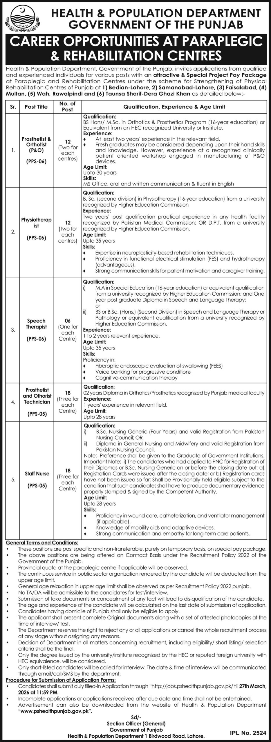 Health & Population Department Punjab Career Opportunities at Paraplegic & Rehabilitation Centres – March 2026
