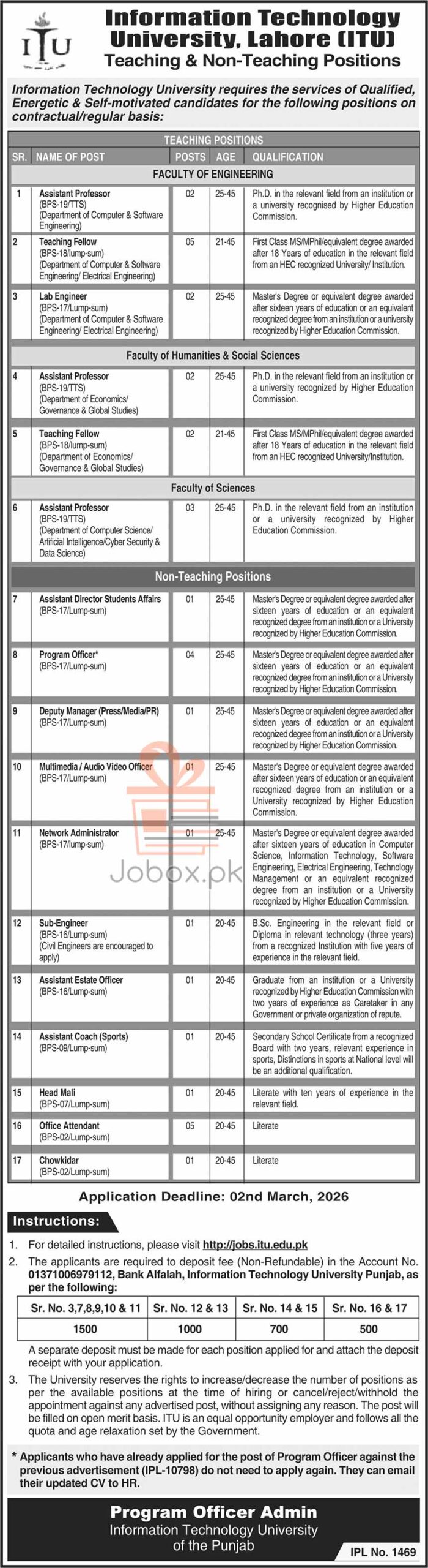 Information Technology University (ITU) Lahore Recruitment 2026