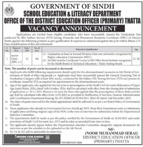 The Government of Sindh School Education & Literacy Department, Office of the District Education Officer (Primary) Thatta, is inviting applications from eligible candidates for the position of Junior Clerk.