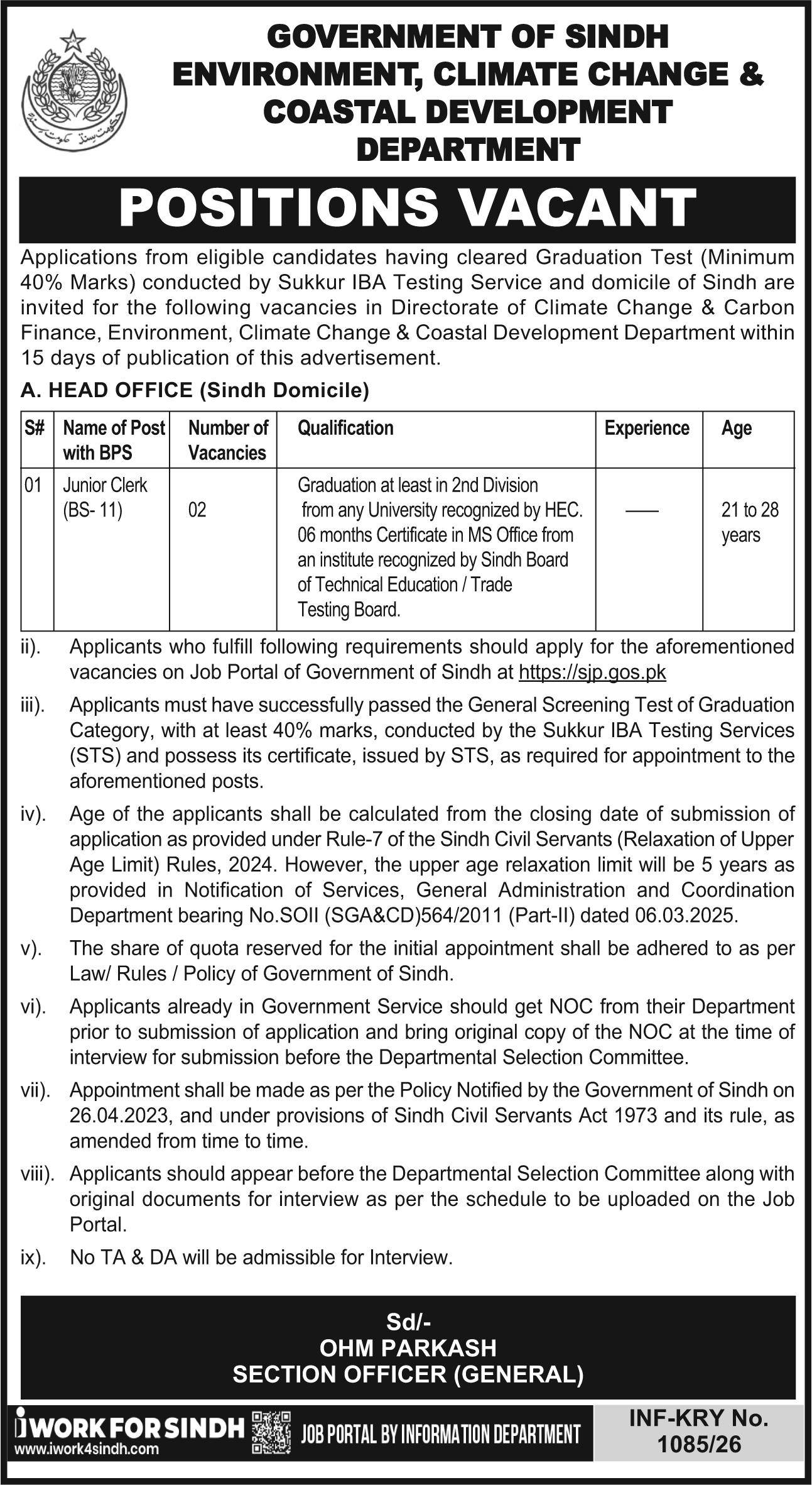 Junior Clerk Jobs in Sindh Government, Climate Change & Coastal Development Department – March 2026