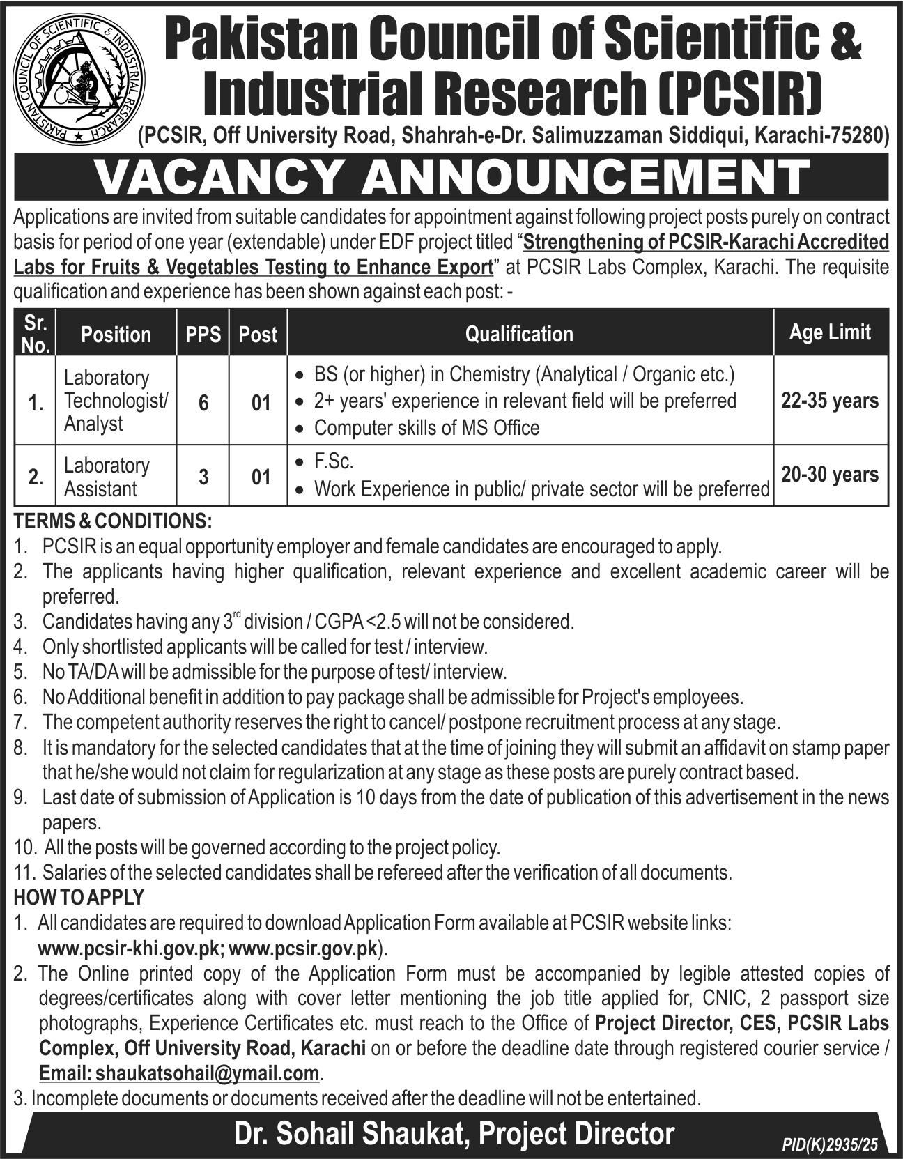 Pakistan Council of Scientific & Industrial Research (PCSIR) is seeking applications for project posts on a contract basis. The project is titled ‘Strengthening of PCSIR-Karachi Accredited Labs for Fruits & Vegetables Testing to Enhance Export’. Applications are invited for the positions of Laboratory Technologist/Analyst and Laboratory Assistant.
