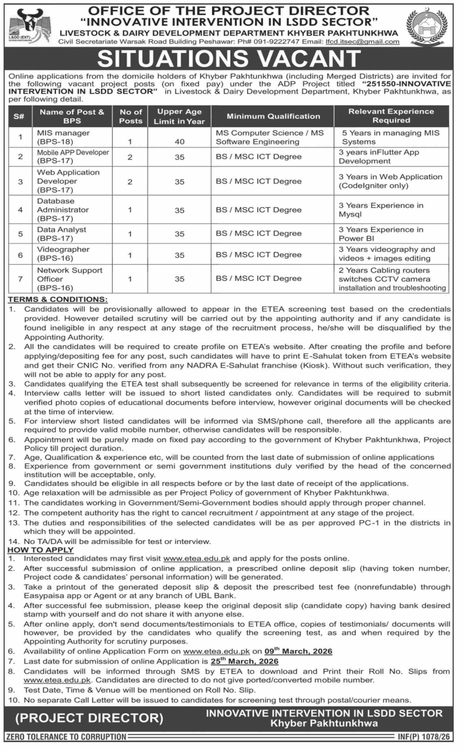 Office of the Project Director, Livestock & Dairy Development Department Khyber Pakhtunkhwa is inviting applications for various project-based positions under the “Innovative Intervention in LSDD Sector” ADP Project. Applications are open to domicile holders of Khyber Pakhtunkhwa (including Merged Districts).