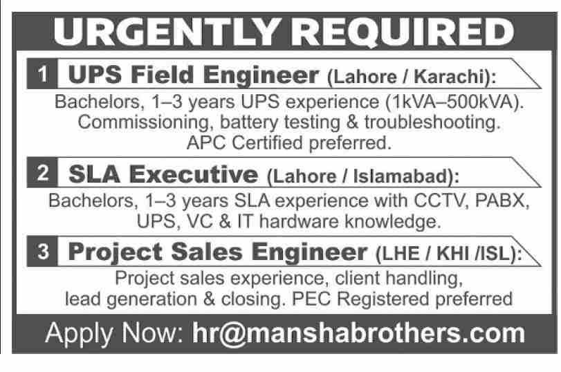 Mansha Brothers: UPS Field Engineer, SLA Executive, Project Sales Engineer – January 2026