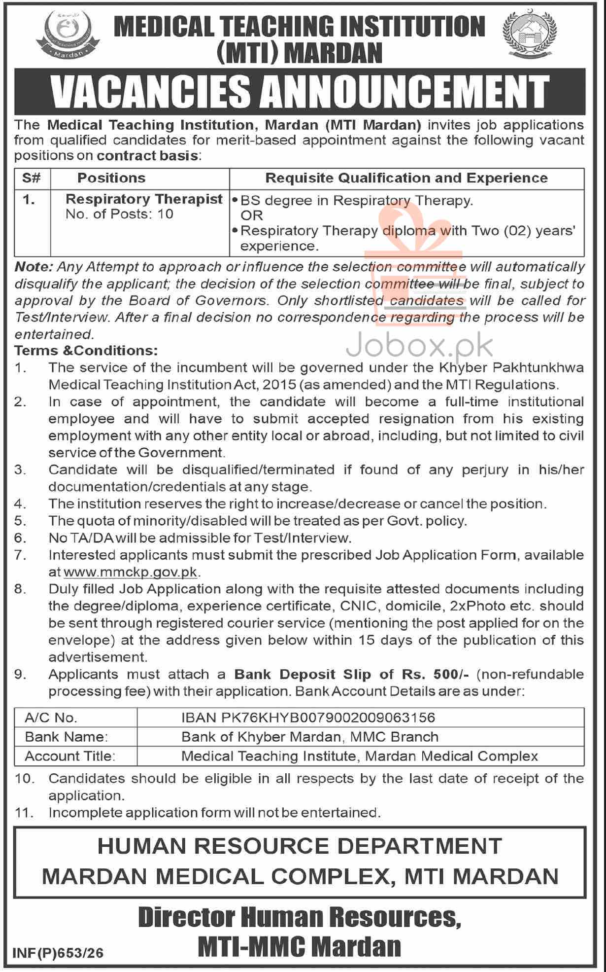 Download the application form from the official website (www.mmckp.gov.pk). Send the filled form along with attested documents and the bank deposit slip via registered courier to the Human Resource Department, Mardan Medical Complex within 15 days.