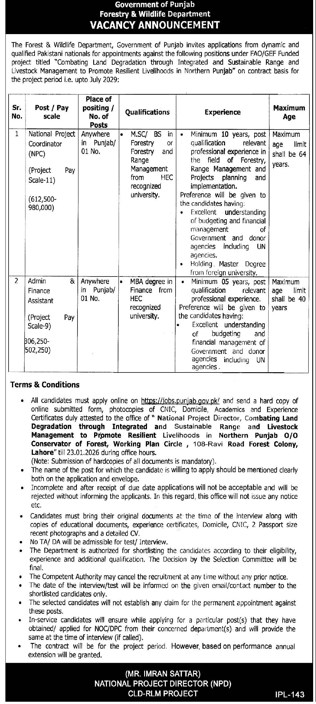 The Forest & Wildlife Department, Government of Punjab invites applications from dynamic and qualified Pakistani nationals for appointments against the following positions under FAO/GEF Funded project titled “Combating Land Degradation through Integrated and Sustainable Range and Livestock Management to Promote Resilient Livelihoods in Northern Punjab” on contract basis for the project period i.e. upto July 2029: