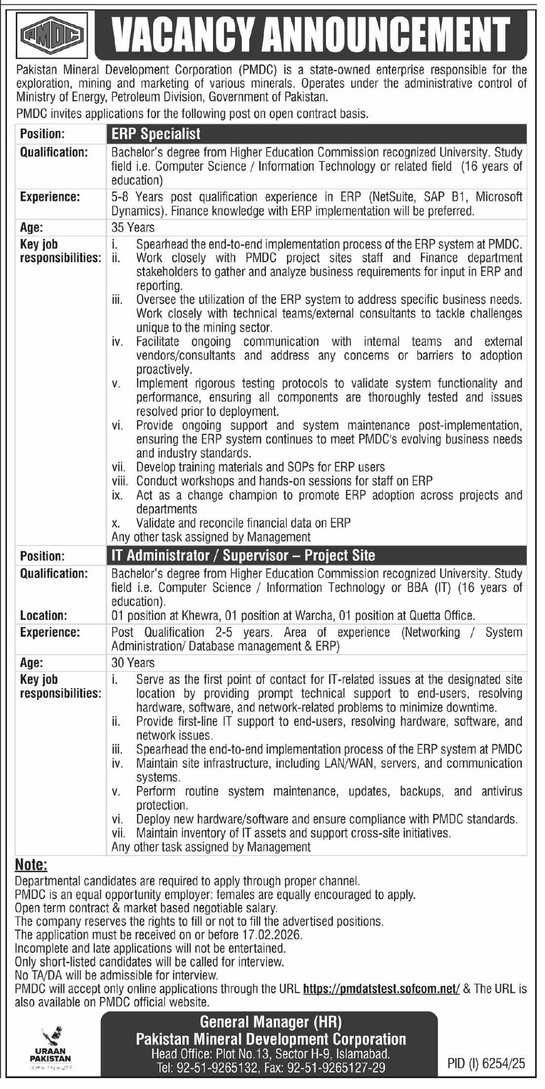 Pakistan Mineral Development Corporation – IT Job Vacancies (February 2026)