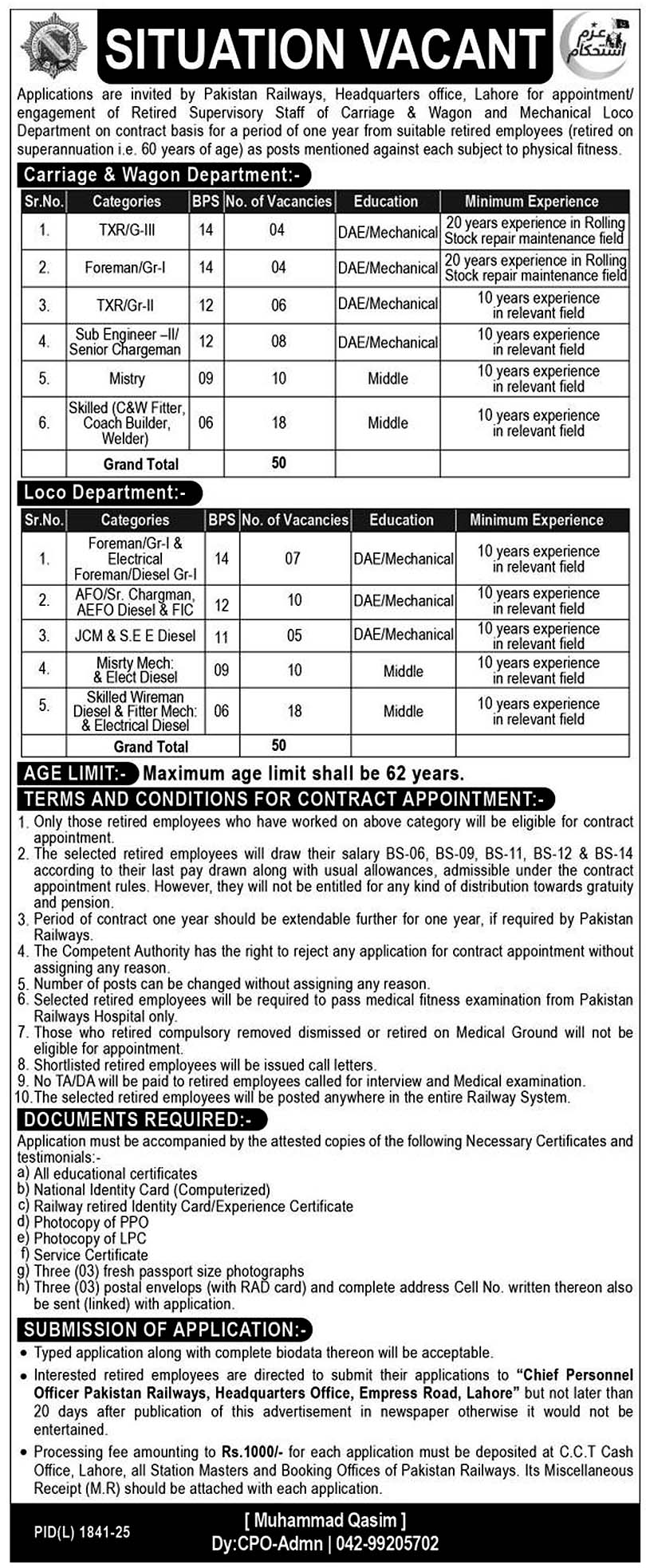 Pakistan Railways Headquarters Office, Lahore invites applications from retired supervisory staff of Carriage & Wagon and Mechanical Loco Departments for contract appointments for a period of one year. These positions are exclusively for employees who retired on superannuation (at age 60) and require physical fitness certification.