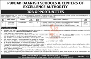 The Punjab Daanish Schools and Centers of Excellence Authority, Government of the Punjab, is seeking applications from dynamic and committed individuals for a non-academic staff position at the Centre of Excellence (Girls) Hafizabad. The appointment is school-specific and initially on a contract basis.