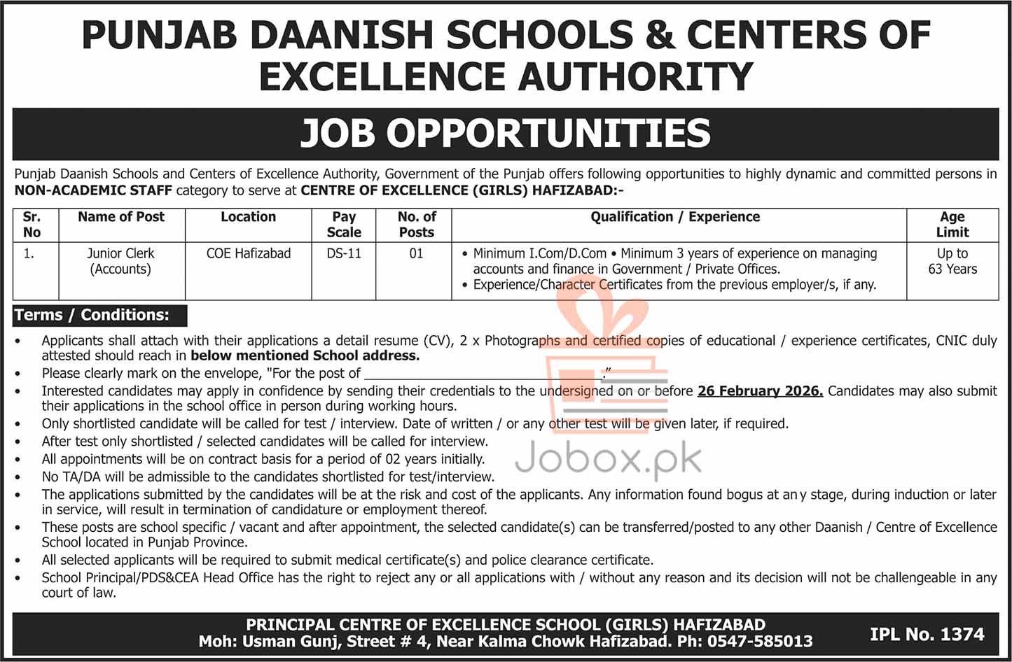 Punjab Daanish Schools Authority Hafizabad Junior Clerk Accounts Jobs February 2026