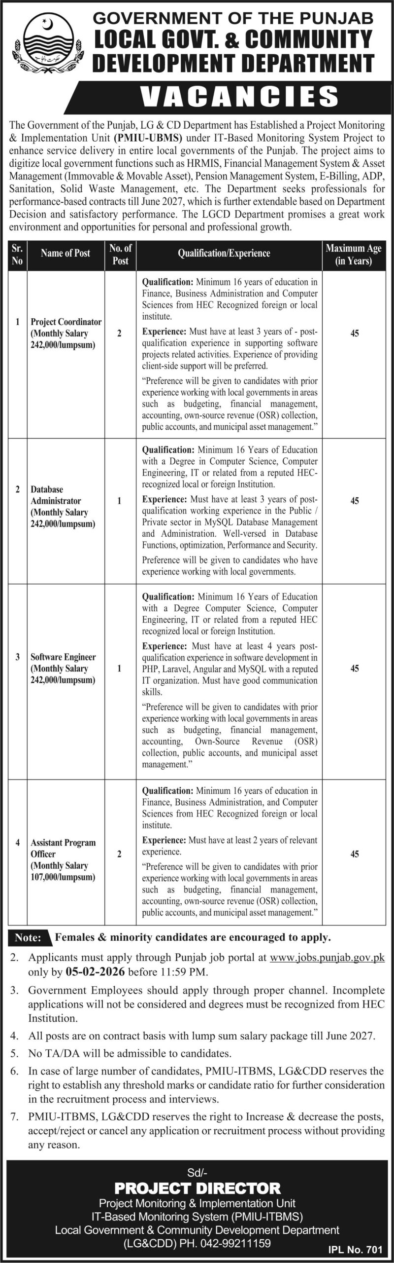 The Government of the Punjab, LG & CD Department has established a Project Monitoring & Implementation Unit (PMIU-UBMS) under the IT-Based Monitoring System Project to enhance service delivery in local governments of Punjab. The project aims to digitize local government functions such as HRMIS, Financial Management System & Asset Management (Immovable & Movable Asset), Pension Management System, E-Billing, ADP, Sanitation, Solid Waste Management, etc. The Department seeks professionals for performance-based contracts till June 2027, extendable based on department decision and satisfactory performance.