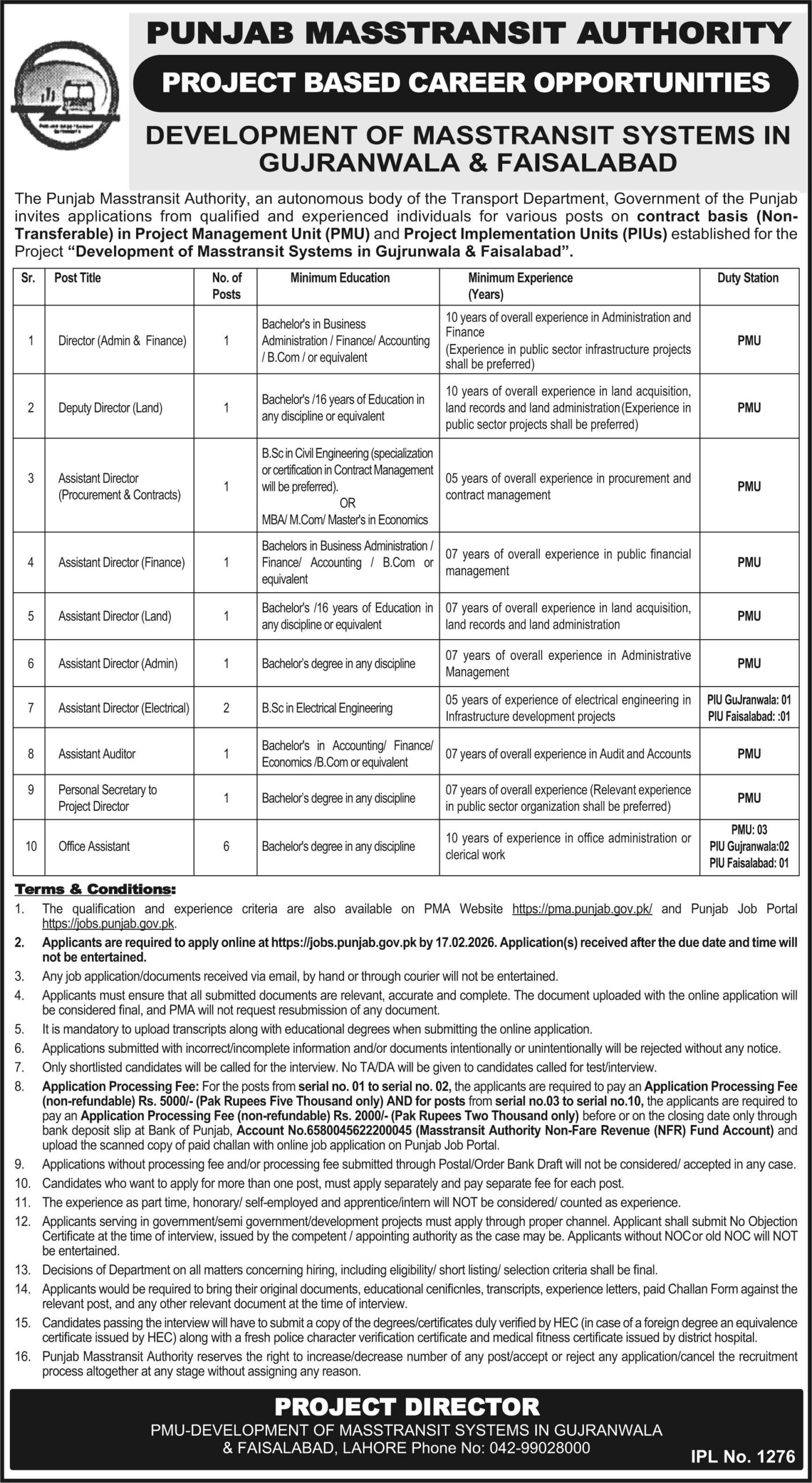 The Punjab Masstransit Authority, an autonomous body of the Transport Department, Government of the Punjab invites applications from qualified and experienced individuals for various posts on contract basis (Non-Transferable) in Project Management Unit (PMU) and Project Implementation Units (PIUs) established for the Project “Development of Masstransit Systems in Gujrunwala & Faisalabad”.