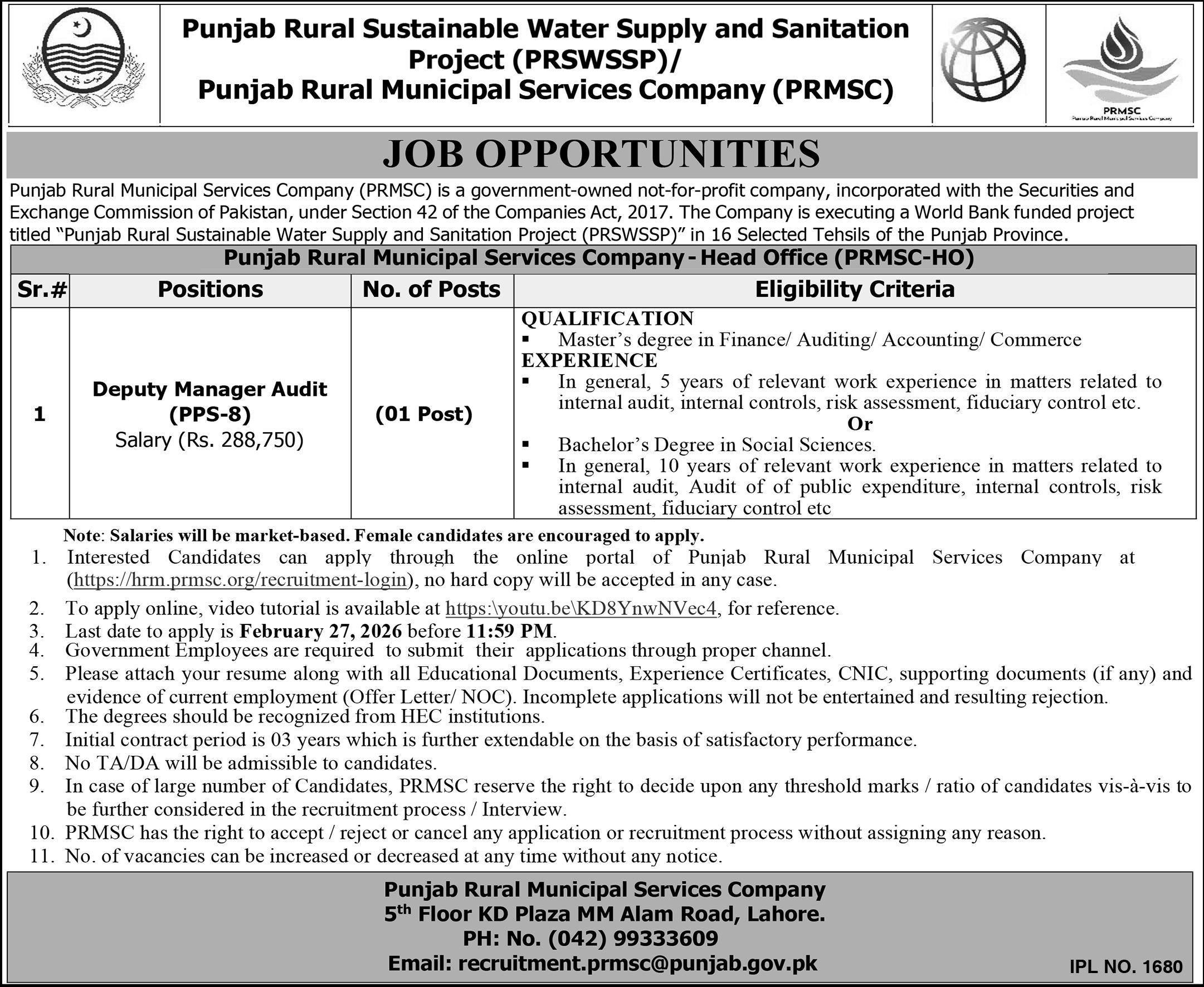 - Interested Candidates can apply through the online portal of Punjab Rural Municipal Services Company at https://hrm.prmsc.org/recruitment-login, no hard copy will be accepted in any case.
