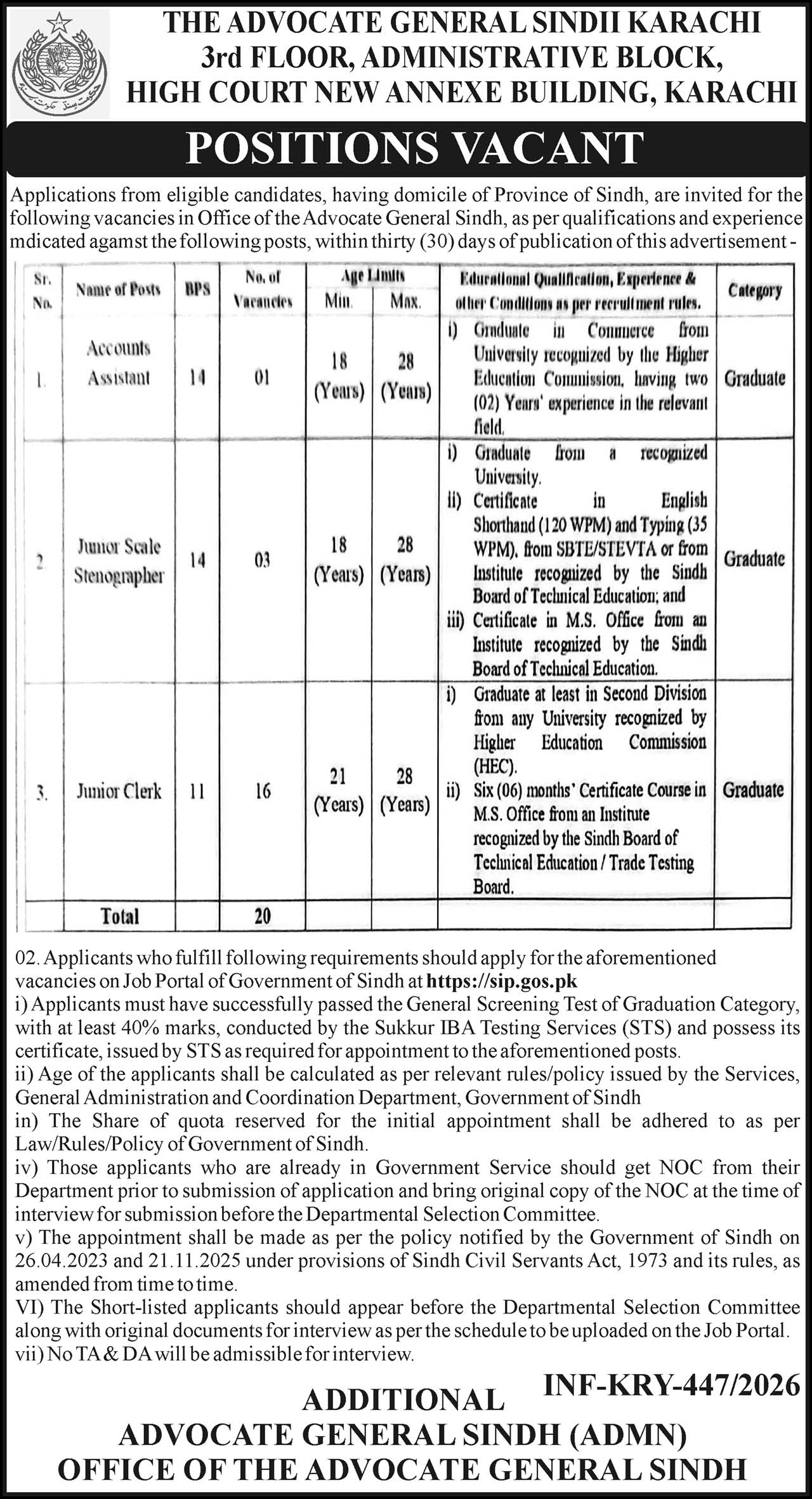 - Appointments will be made as per the Government of Sindh’s policy dated 26.04.2023 and the amended rules of the Sindh Civil Servants Act, 1973.