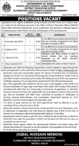Applications from eligible candidates having domicile and PRC (Form-D) of District Malir are invited for the following vacancies in the Office of District Education Officer (ES&HS) District Malir Education Department, as per qualification and experience indicated against the following posts, within fifteen (15) days of publication of this advertisement: