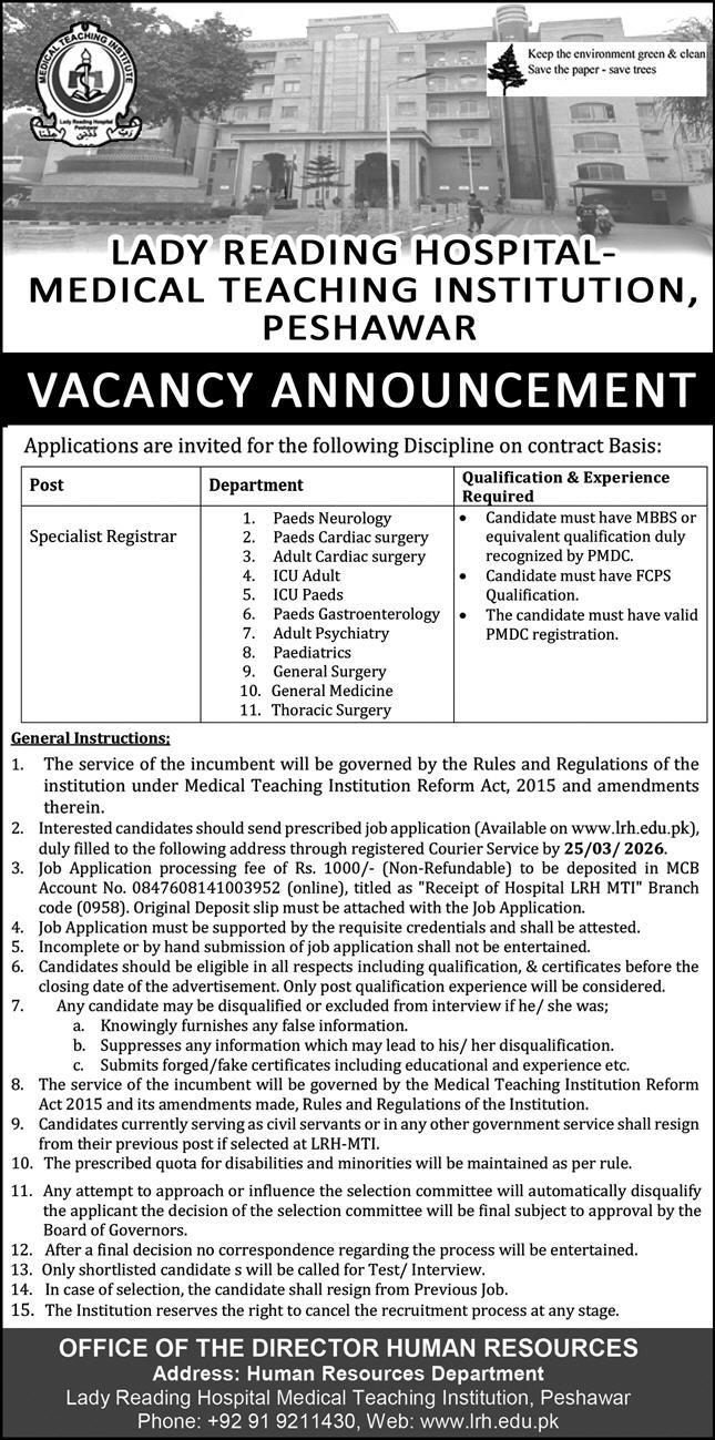 Specialist Registrar Vacancies at Lady Reading Hospital Medical Teaching Institution, Peshawar – March 2026