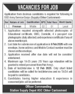 Application from desirous candidates is required for following in SSD Army Service Corps (Supply) Chhor Cantonment: