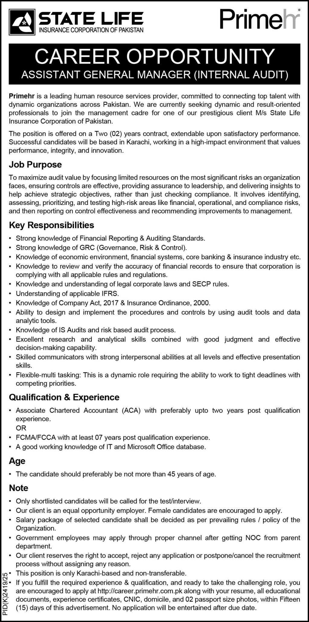 PrimeHR, a leading human resource services provider, is seeking dynamic and result-oriented professionals for the position of Assistant General Manager (Internal Audit) for their prestigious client, M/s State Life Insurance Corporation of Pakistan. This is a contract-based position offering an opportunity to work in a high-impact environment that values performance, integrity, and innovation.