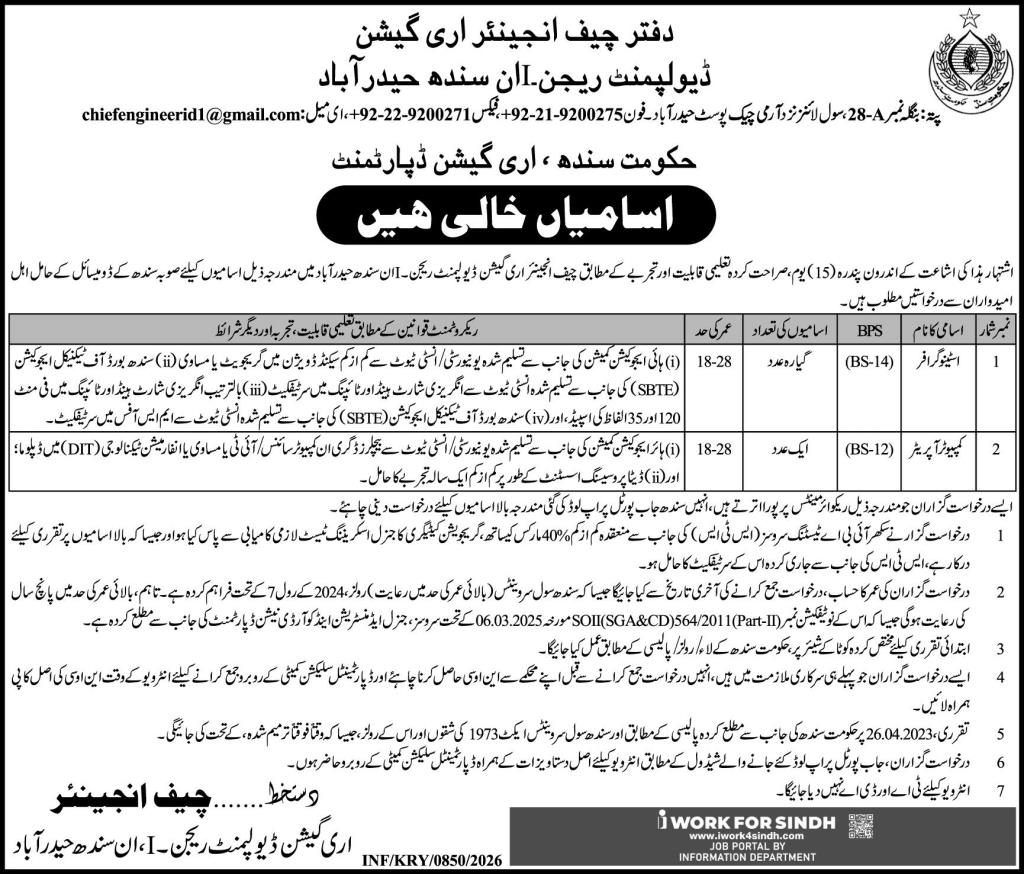 Office of Chief Engineer Irrigation, Development Region-I, Sindh Hyderabad, under the Irrigation Department, Government of Sindh, has announced latest vacancies for eligible candidates holding domicile of Sindh province. Applications are invited from local residents for the posts of Stenographer and Computer Operator. Candidates must apply within 15 days of advertisement publication through the Sindh Government Job Portal.