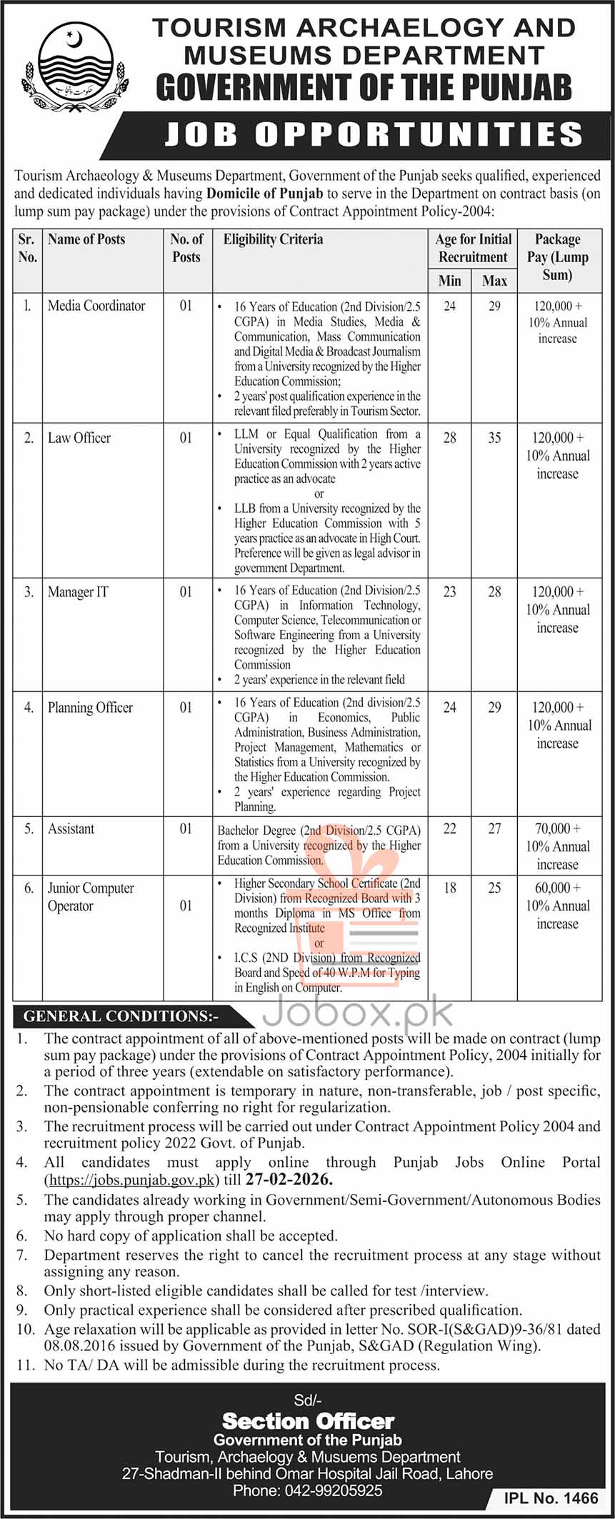 The Government of the Punjab, Tourism, Archaeology and Museums Department is seeking qualified, experienced, and dedicated individuals with a Punjab domicile. These positions are offered on a contract basis for an initial period of three years under the Contract Appointment Policy, 2004.