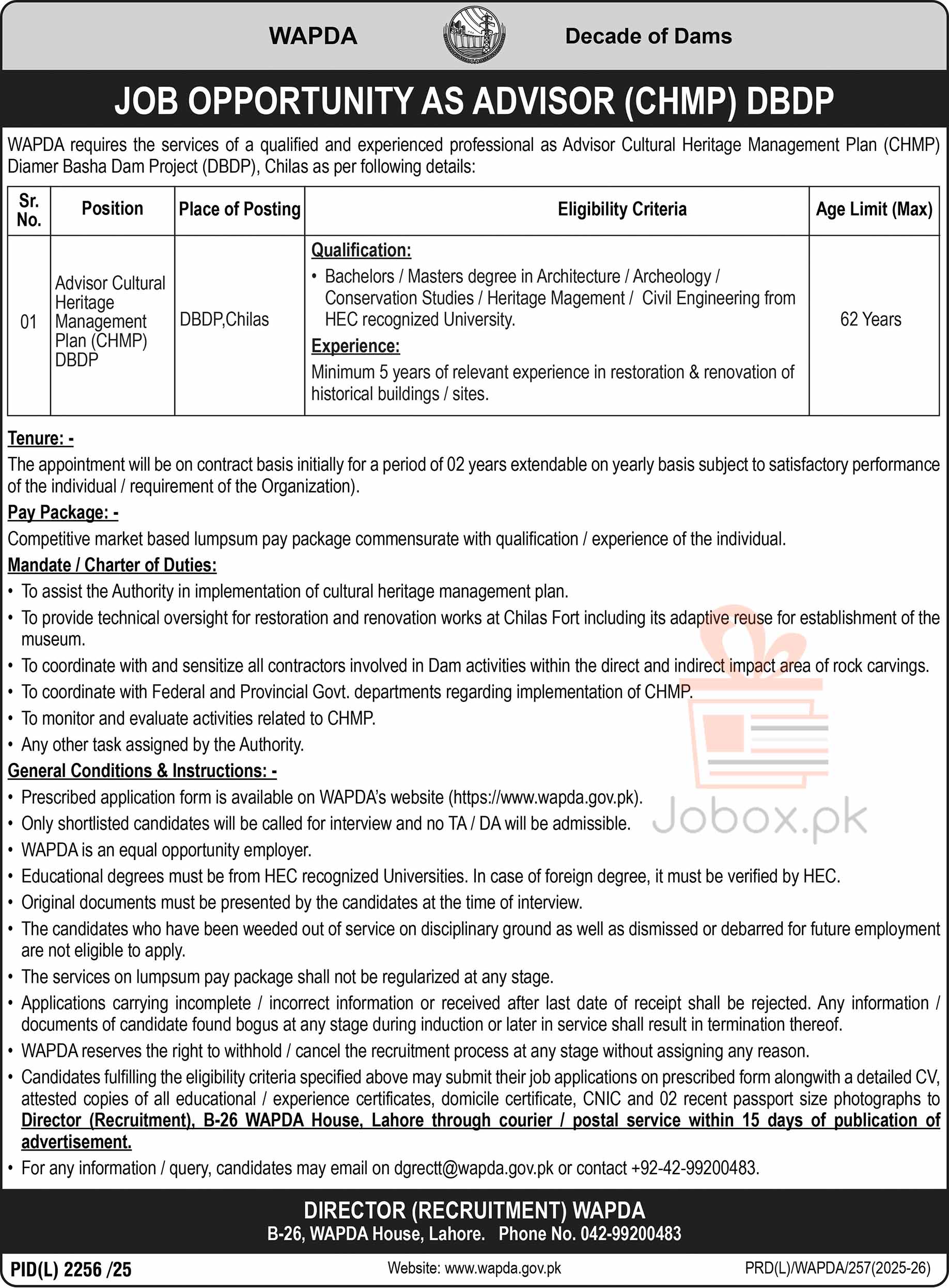 - Candidates fulfilling the eligibility criteria specified above may submit their job applications on prescribed form along with a detailed CV, attested copies of all educational / experience certificates, domicile certificate, CNIC and 02 recent passport size photographs to Director (Recruitment), B-26, WAPDA House, Lahore through courier / postal service within 15 days of publication of advertisement.